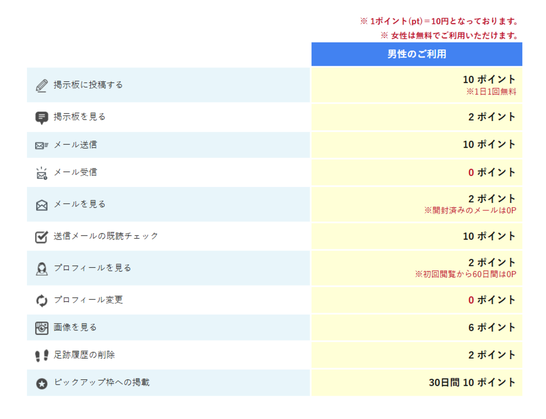男性は登録料も月額料金もかからず、メールを送るなどの操作をするときだけポイントを消費します。